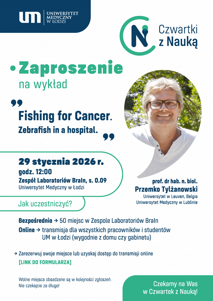 Gościem cyklu będzie prof. dr hab. n. biol. Przemko Tylżanowski z University of Leuven (Belgia) oraz Uniwersytetu Medycznego w Lublinie, który wygłosi wykład pt. „Fishing for Cancer. Zebrafish in a hospital.”