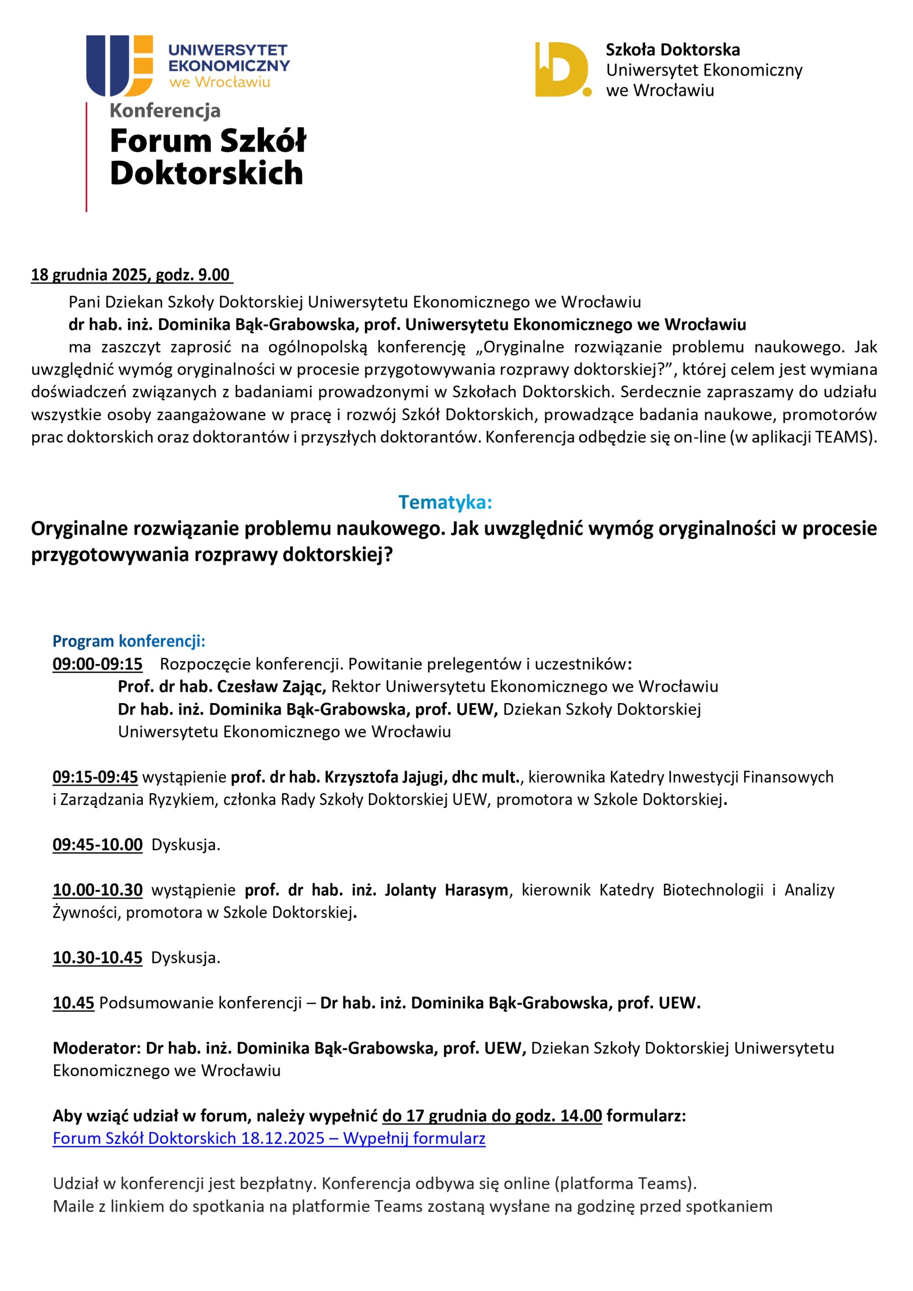 Dziekan Szkoły Doktorskiej Uniwersytetu Ekonomicznego we Wrocławiu dr hab. inż. Dominika Bąk-Grabowska, prof. UEW ma zaszczyt zaprosić na ogólnopolską konferencję „Oryginalne rozwiązanie problemu naukowego. Jak uwzględnić wymóg oryginalności w procesie przygotowywania rozprawy doktorskiej?”, której celem jest wymiana doświadczeń związanych z badaniami prowadzonymi w Szkołach Doktorskich. Serdecznie zapraszamy do udziału wszystkie osoby zaangażowane w pracę i rozwój Szkół Doktorskich, prowadzące badania naukowe, promotorów prac doktorskich oraz doktorantów i przyszłych doktorantów.